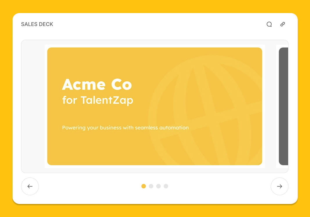 Share your most important presentations and documents in an easily digestible format. Embed sales decks, product presentations, implementation guides, or pricing PDFs directly in your room. Buyers can view these materials without downloading files or switching platforms, and you'll know exactly who's viewing what content.
